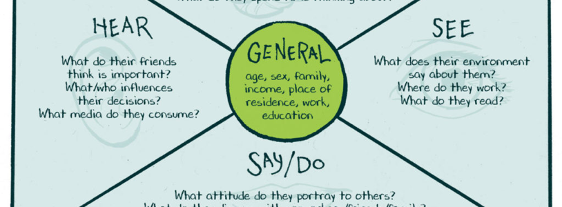Osnovne informacije o svojih strankah verjetno poznate (GENERAL) – starost, spol, bivališče, izobrazba, delovno mesto ter prihodek. Ker pa je za resnično poznavanje strank te informacije treba nadgraditi, se je v naslednjem koraku smiselno vprašati (THINK/FEEL), česa si vaše stranke želijo, k čemu stremijo ter kako razmišljajo. Svoje poznavanje boste nadgradili z nadaljnjo uporabo diagrama (SEE) – premislite o delu, ki ga opravljajo vaše stranke, ter o okolju, v katerem bivajo. Morda se velja posvetiti tudi temam, ki se na prvi pogled zdijo nerelevantne, kot je razmislek o čtivu, ki ga vaše stranke prebirajo. V naslednjem koraku (SAY/DO) se posvetite strankinim stališčem, temam vsakodnevnih pogovorov ter prostočasnim aktivnostim. Analizo zaokrožite s premislekom (HEAR) o vplivih, ki jim je stranka izpostavljena – čigavo mnenje šteje, kako sprejemajo odločitve ter kako uporabljajo medije. Zgornji diagram naj služi kot osnova za razmislek, seveda pa je dobrodošlo, da analizo nadgradite z inovativnimi pristopi, ki bodo omogočili natančno razumevanje vašega ciljnega občinstva. Načrt zaključite s povzetkom pozitivnih in negativnih vidikov vsakdanjika vaše stranke.